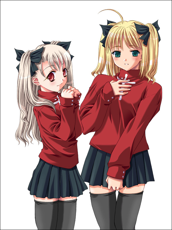 ■2004.04.10 『Fate/stay night』からセイバーとイリヤ。 TYPE-MOON、第一回Fate人気投票で応援絵として投稿しました。 セイバーとイリヤで凛のコスプレ。勿論、凛応援。 ツインテールツインテール。( ゚д゚)ヴァー