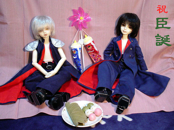 ということで、お誕生日おめでとうヲミー! ![]() すっかり遅れて今日は既に7日ですが、某様曰く「誕生日は前後6ヶ月がお祝い時」ということらしいので、お祝いしてみました。ヲミーと先輩でおみ誕。あ。酒も一緒に置けば良かったなー。 うしろでオミコ達もお祝い(?) ![]() 男兄弟が居ない女子のあこがれ、鯉のぼりde人魚スタイル☆ オミコがやるとただの 筆頭団子と赤伊達餅でお祝いします ![]() 三色団子をミニサイズに作ってみました。串は爪楊枝です。結構小さい。 色は食紅と抹茶でつけました。更に先輩団子(白)には黒糖餡で眉を描き、伊達団子(緑)には猫髭を描きました(こっちは色を入れていないのでちょっと見づらい)。桃に鉢巻がついていないのは、途中で白が足りなくなったから。ごめん桃。 そして赤伊達餅 ![]() 見えますかー?矢印の先がうっすら緑になってるのが。白いガワの上に緑のガワをのせた赤伊達柏餅です(画像左下にあるとおり)。中は大納言を黒糖で煮た黒糖餡、な ん で す が、風味が黒糖に負けました。ううん残念。 ちなみに、伊達が緑なのは伊達→仙台→ずんだ→緑!という連想ゲームの結果です。最初はずんだ餡を挟んだ赤伊達柏餅にしようかとも思っていたんですが、イベント後にくまがぶっ倒れ、買い出しに出られなかったため、有りもので作ったらこうなりました。今度ずんだ餡の大福でも作るかな。赤伊達大福。白玉入りのずんだ善哉……だと伊達赤になっちゃう? いや、ずんだ(伊達)の中に白玉(先輩)が入っているんだから屹度赤伊達。よし桃白玉も入れて赤伊達桃伊達ごたまぜスイーツにしてやろう。<本気か? ともあれ。ヲミー、お誕生日おめでとう。 最後までご覧下さりありがとうございました。 |