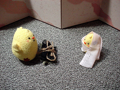 ガブリエル「おめでっとさーん!ごっつ恵まれてる嬢ちゃん! 神はんがあんたはんと一緒におんでぇ。」 マリア「!(な、なんのことだろう。ヲロヲロ)」 ガブリエル「マリアはん、なーんも恐れることあれへん。アンタはんは神はんから お恵みたーんと貰たんや。あんたはんはお腹にやあこできて男ン子 産むよってに、そン子をイエスて名づけなはれ。」 マリア「(えー!)どどどどどうして、そんなことがおこっちゃうの? 私、まだ男の人、知らないんだよ?(アワワ」 ガブリエル「聖霊はんがあんたはんに降りてきてな、神はんの力があんたはんを包むンや。 せやから生まれる子ぉも聖なるモン、神はんの子ぉ呼ばれるようになんねん。 神はんにできんことは何一つあれへんでぇ。」 マリア「私は主にお仕えする小さいものだけど、お言葉通りこの身に成りますように。」 (↑微妙に棒読み) ほいでからマリアはんはヨセフはんとなんもせぇへんうちにおかんになりおったんや。 第1週 終 以下撮影舞台裏。 ↓兄さんぴよ着替え中。後方注意。