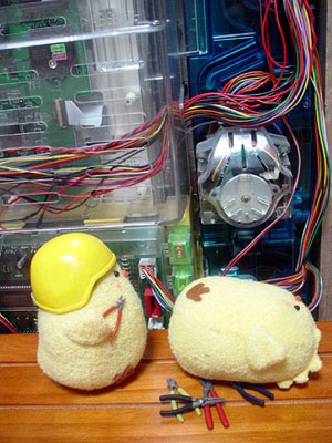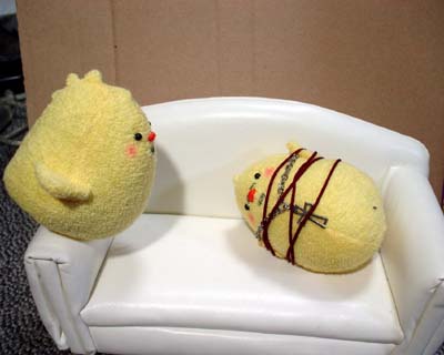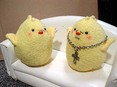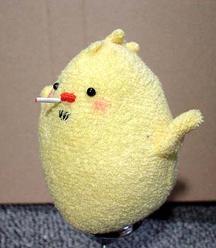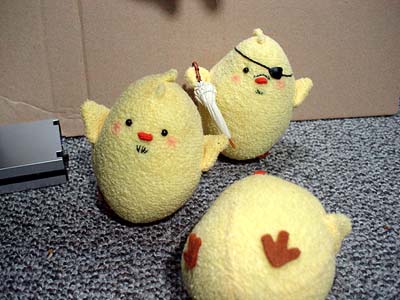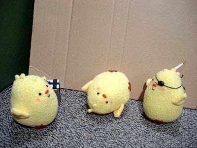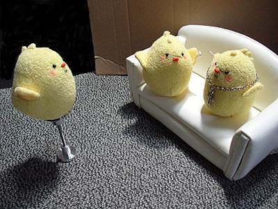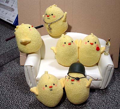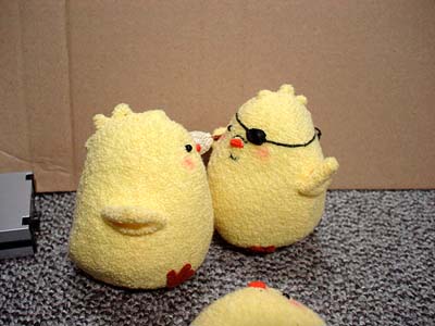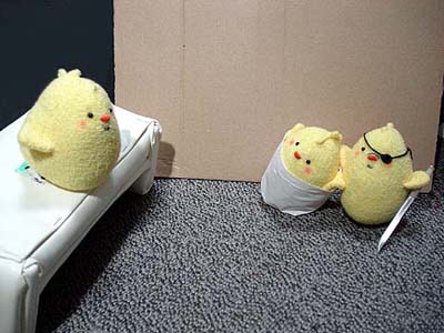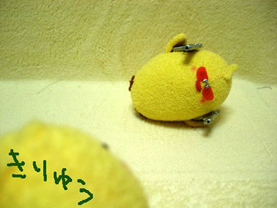 後ろで転けてるティッシュボックスは見なかったことにしてください。 兄さんのメットはそのうち塗装します。ごめんなさい。 ちなみに。 いすの背に乗っているクロスペンダントが大吾ぴよ。 向かい合って日本刀抱えてるのが龍司ぴよ。(嘴の傷が見えないー) イスに並んで座ってるのが柏木ぴよ(傷)と一輝ぴよ(赤いポケットチーフ) イスの下に並んでいるのが桐生ぴよと真島ぴよ…です一応。 で。現在嶋野ぴよがつくりたい病発症。虎親父が好きなんダー!(咆吼) …ちょっとだけ他よりおっきなちょいでかぴよ作ろっかなー。とさかのないやつ。 もともとは、UFOでとったぴよに遥ちゃんがイタズラして「おじさんぴよ〜」とか遊んでいるつもりで作ったのですが、如何せん自己主張の烈しいぴよどもなので、いっそみんな揃えたろカー!という気になりかけてます。 となると錦ぴよは背中に金魚?風間ぴよは杖?二丁拳銃??遥ぴよはちょいミニぴよ?寺田ぴよはマフラーぴよ?(1の埠頭戦やりたいらしい。)番外編としては、黒で亜門ぴよとか赤で荒瀬ぴよとか白で山岡ぴよとかも欲しい気がします。<大本気 ど こ ま で い く ん だ ! やってる本人にもさっぱりわかりません★ ◆'07年2月25日分◆ 足のないぴよズで撮影した分の最後です〜。<今日足つけた。 やっぱ桃源郷は外せないよな!ということで頑張れ兄さんぴよ! ↓龍如2:1章 路地裏にて