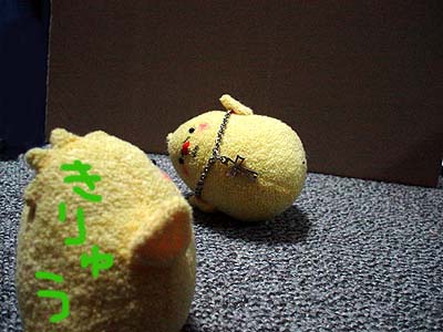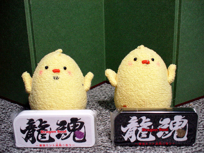 イイトコで止められて、ふて腐れてる兄さんぴよがちょっと可愛い。 余りに激しく見つめ合ってるもんだから、何かこのままちゅーしろちゅーとか思ったり思わなかったり(どっちだ)。 相変わらずぴよぴよぴよぴよしてますが、楽しんで頂ければ幸いv そういえば、嶋野ぴよ作ってみたらでかすぎました。現在作り直し中。遥ぴよは小さすぎて大変ですが週明けまでに増やせるといいなー。 ◆'07年4月13日分◆ 近所のスーパーでユカリが妙〜なものを見つけてきました。うん。多くは語りません。見てわかってやってください。 ↓双龍ぴよズの魂
