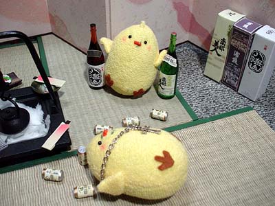 ↓一升瓶を両手に抱えてご満悦の龍司ぴよと、ビールを飲み倒してへべれけの大吾ぴよ