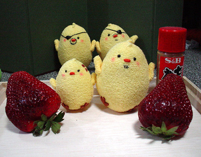 遥ぴよ「…おっきないちごだねぇ。かくれんぼできるよ!」 …でかいというかでかすぎるというかなんというかかんというか。 ↓おっきないちご発見兄さんぴよズ