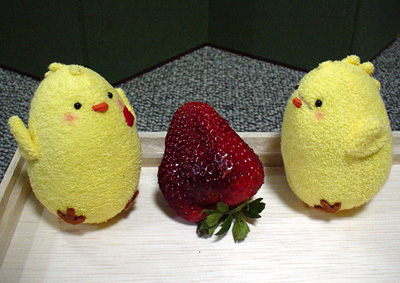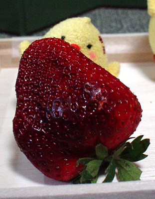 なんか凄いサイズの覆盆子(華訳で草莓)をユカリが見つけてきました。名前は「アイベリー」。ちょっと昔の品種で、現在は生産農家がたいへん限られている別名「幻のいちご」だとか。折角の大きさなのでぴよと並べて撮影してみました。<却って解りづらい。 ↓色々大きさ比較〜。
