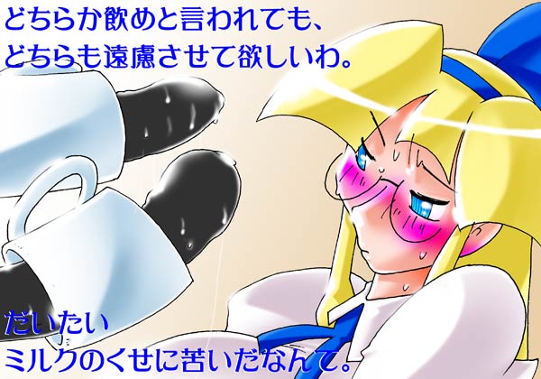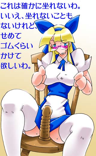 | 「バターの後は、おいしいミルクティーをどうぞ。」 なにを思ったか帽子屋は底抜けカップに一物さして、アリスの顔に突きつける。 「今度は私の番だろうよ。」 ウサギもまけじと突きつける。 |