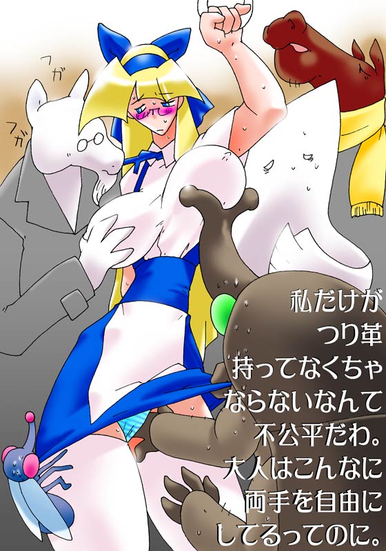 | 自称大人のヤギやかぶとむしたちは、つり革を持っているせいで手が塞がっているのを良いことに、アリスの全身をまさぐる。 特にかぶとむしは、4本もある手を一度にスカートにすべりこませてきた。 |