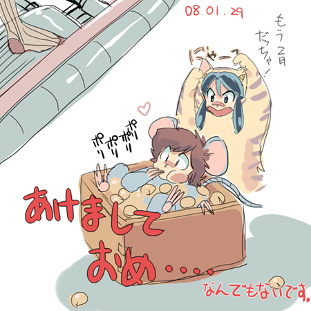 いただいたクリスマスカードと年賀状に、お重を返す時の飴ちゃんのように入れた絵。 なんとどちらも1月29日!ごめんなさい。 ネタは当然のようにパクリです。 | |