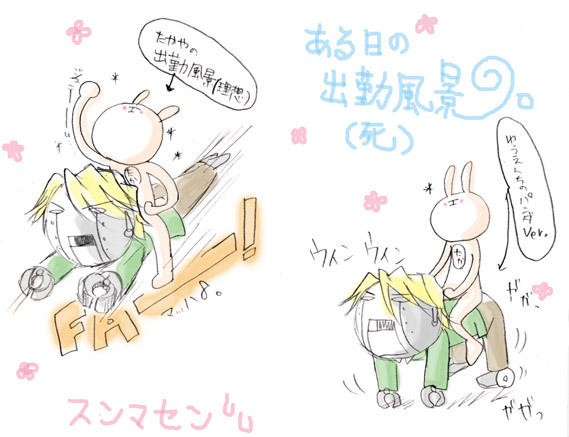 イヤガラセ石田第●弾。 太一とケッコンしたら(ヲイ)こんな通勤をしたい…と描いたモノ(爆死) ……の り た い (笑)そして…またも石田FANなお方…本当にスミマセン; <20040813UP> back<< GALLERY